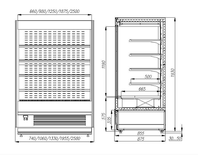 Обшивка корпуса, моторный отсек, стойки и поддон изготовлены из пищевой стали. В продаже доступна модель с покрытием панелей INOX. Выбрать открытую витрину линейки Карбома Куб с иными параметрами поможет каталог.
