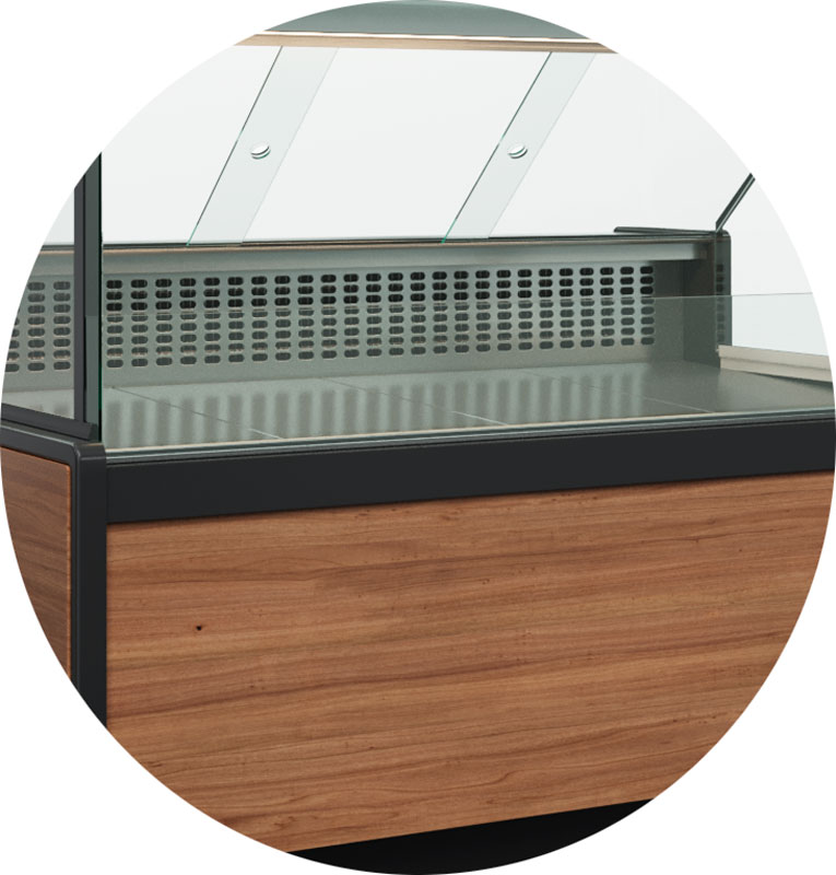 - Боковины со стеклопакетом 45 мм, под цвет витрины (дуб или мариель)